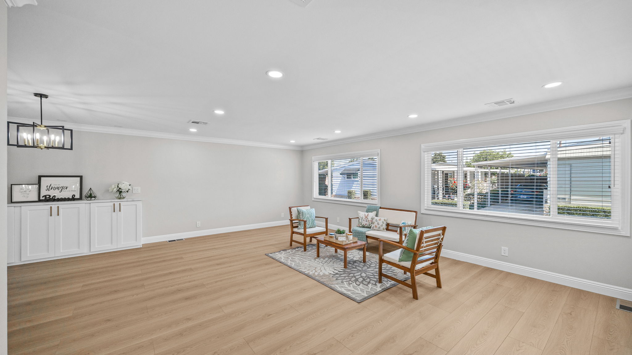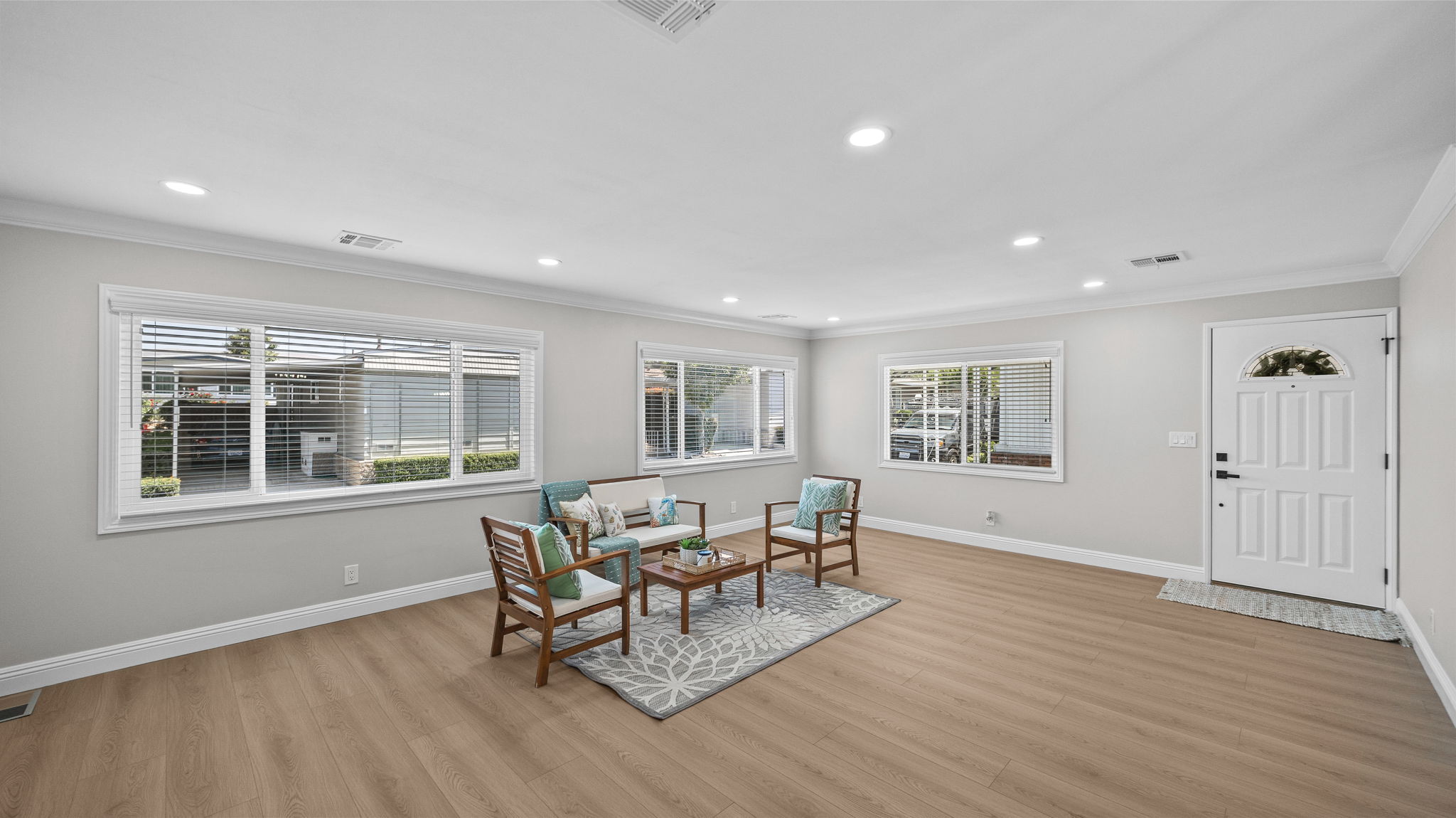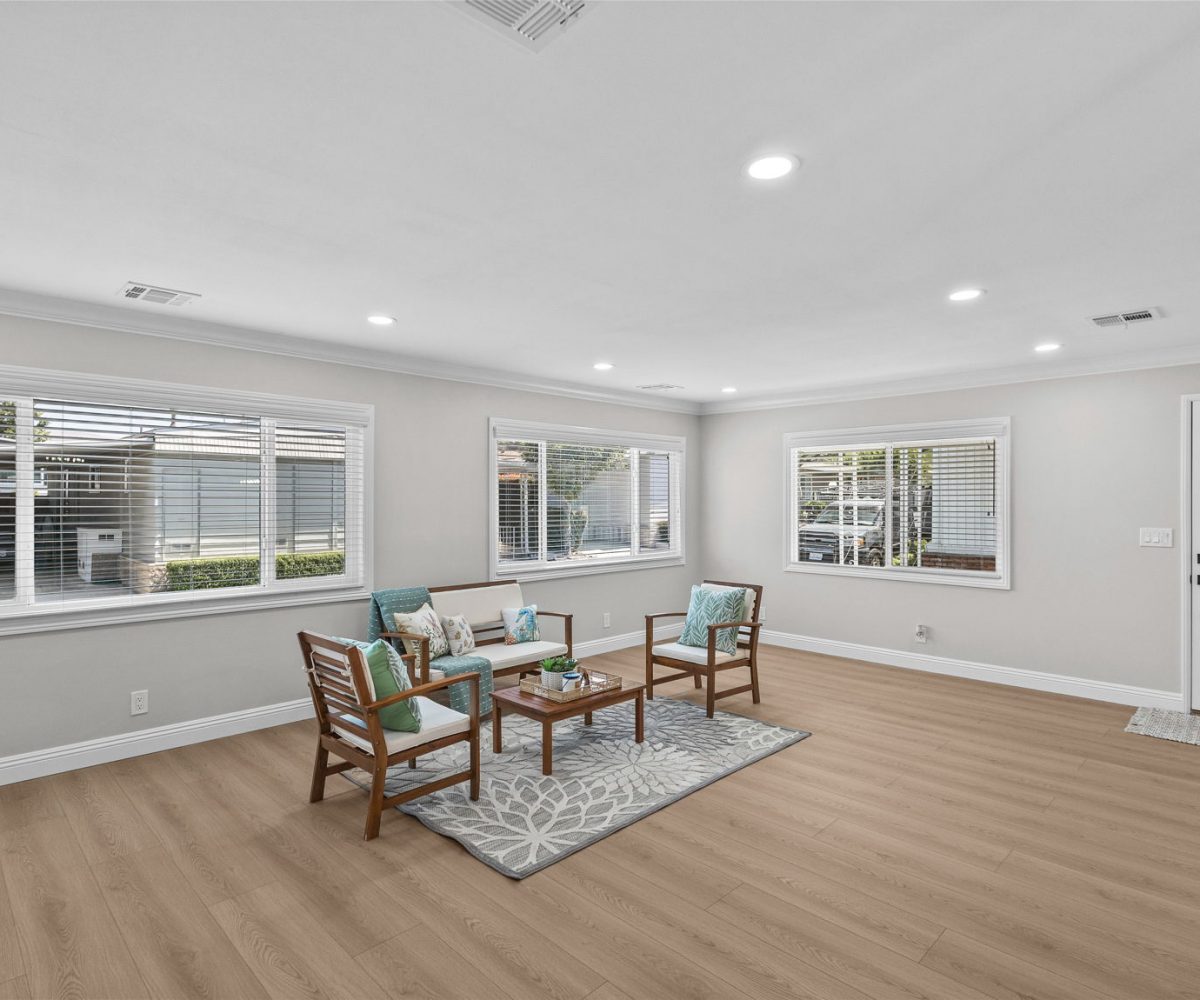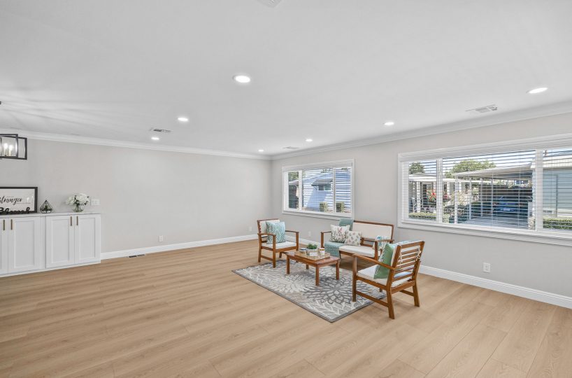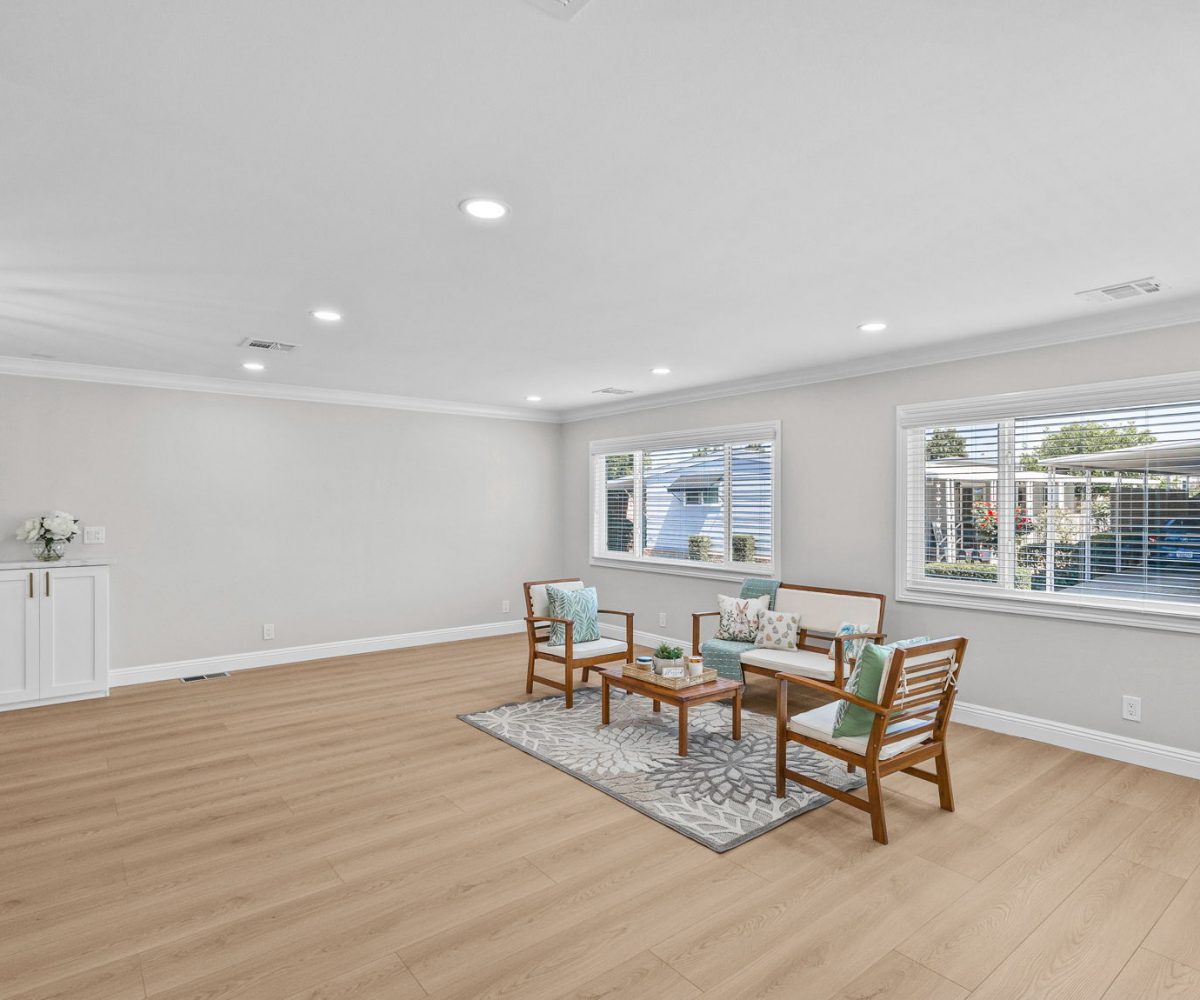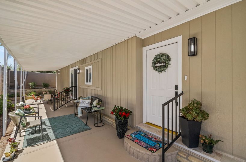 Senior Park Community 55+…This is the perfect opportunity to buy this REMODELED bright spacious 2 bed, 2 bath home with a GREAT LOCATION just inside the community. Just like New! Let’s enter this beautiful home from the east facing private patio. As we walk in, we are greeted by the open living room and dining room area that is bright and beautiful. The kitchen is around the corner, and it features quartz countertops, a large island, soft close doors and drawers, new appliances. The laundry area leads to the back door and another entrance for the guest bath to the left. There is a small den area off the kitchen that has another built-in for extra storage. The guest bedroom is off to the right and it has its own entrance to the guest bath. The primary is straight ahead having its own updated en-suite featuring a tile shower with a bench and double sinks. This home has new luxury vinyl laminate flooring throughout, partially new windows, new appliances, crown molding, recessed lighting, new roof, newer water heater, a/c, furnace and new washer and dryer. Everything is ready for you to move in today! With this home being updated from front to back, it will not last long on the market! Look no further, this is the home you have been looking for. Move in ready!